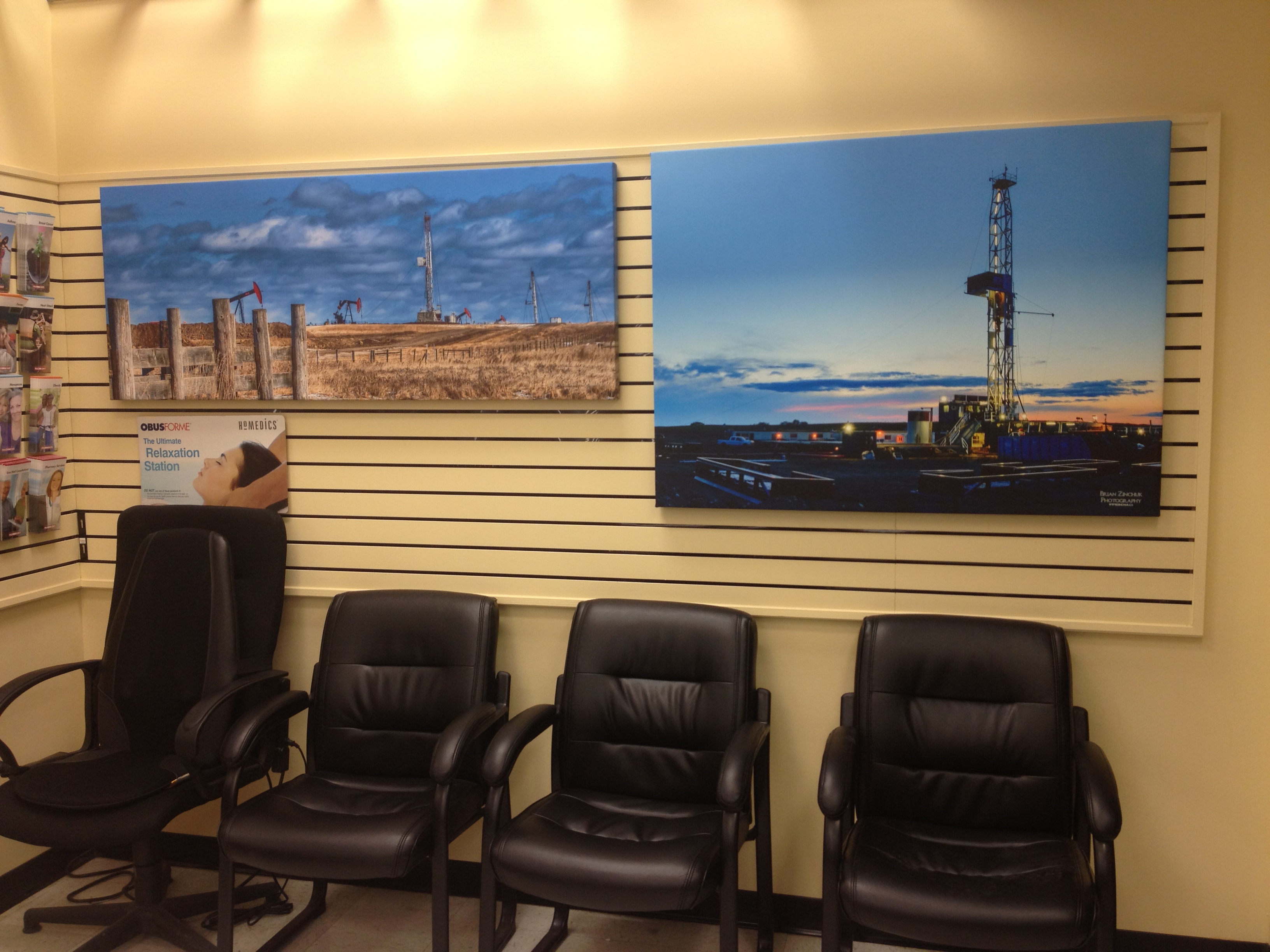 These are my first fine art canvas wrap prints, available for sale at Estevan’s Pharmasave. On the left is “Freestone,” and the right is “Vortex Rig 1 at Dusk.”
